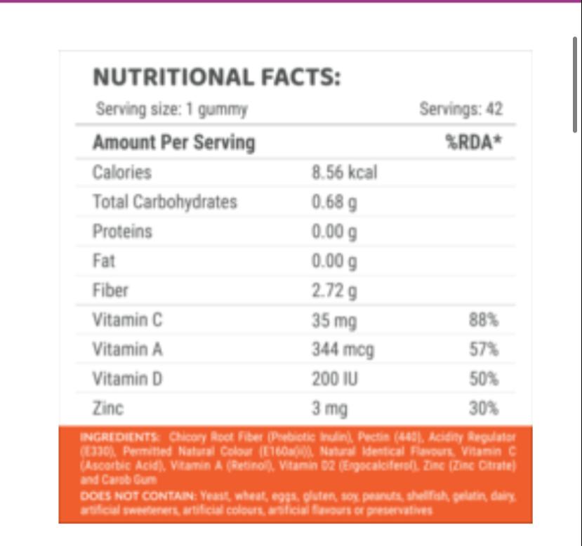 This is rich in Vitamin C, D, A & Zinc. It contains 42 chewables which has a fresh orange flavour. Along with that it has no sugar, no preservatives, no gluten , no artificial colours and is non – GMO.